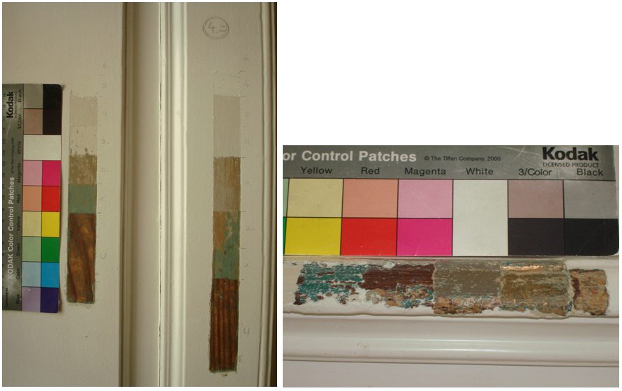 Paint finishes on timber reveal to window (l) and dado rail (r), town house in Basel city, Hebelstrasse.