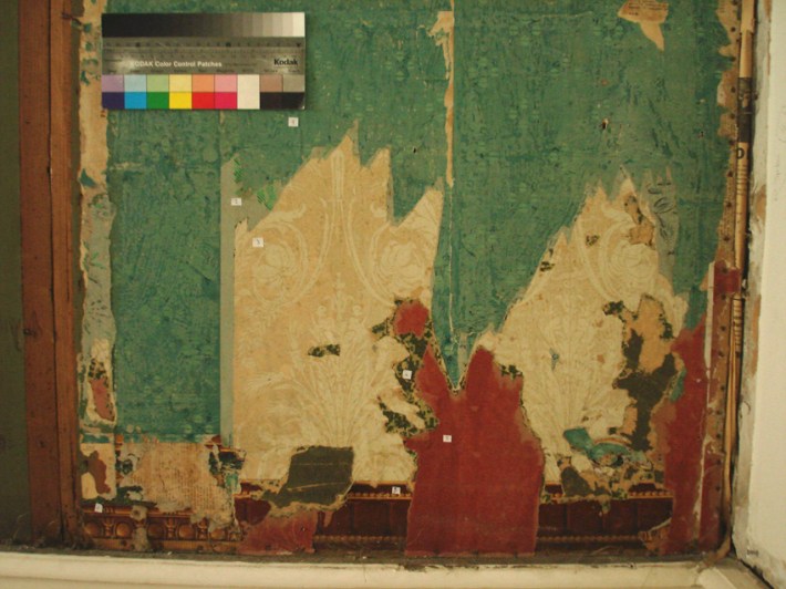 Discovered historic wall papers behind facing boards. Oldest wall paper layer ca. 1820. Town house in Basel city, Hebelstrasse.