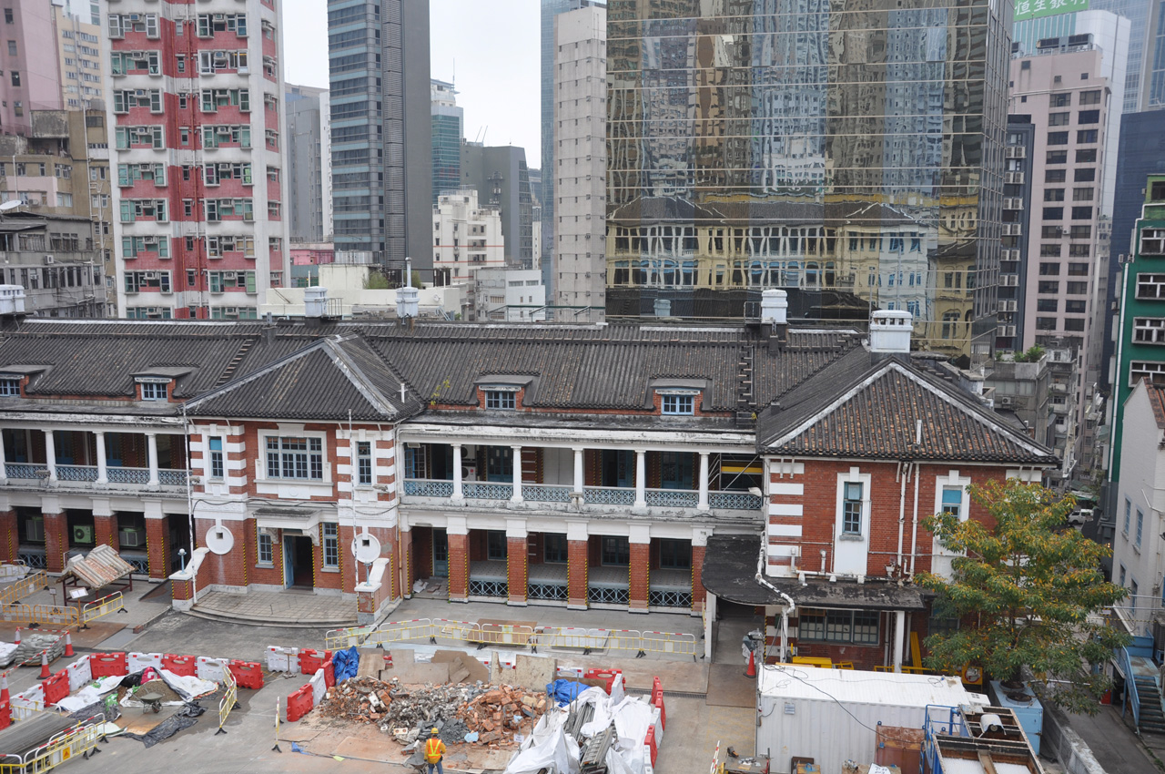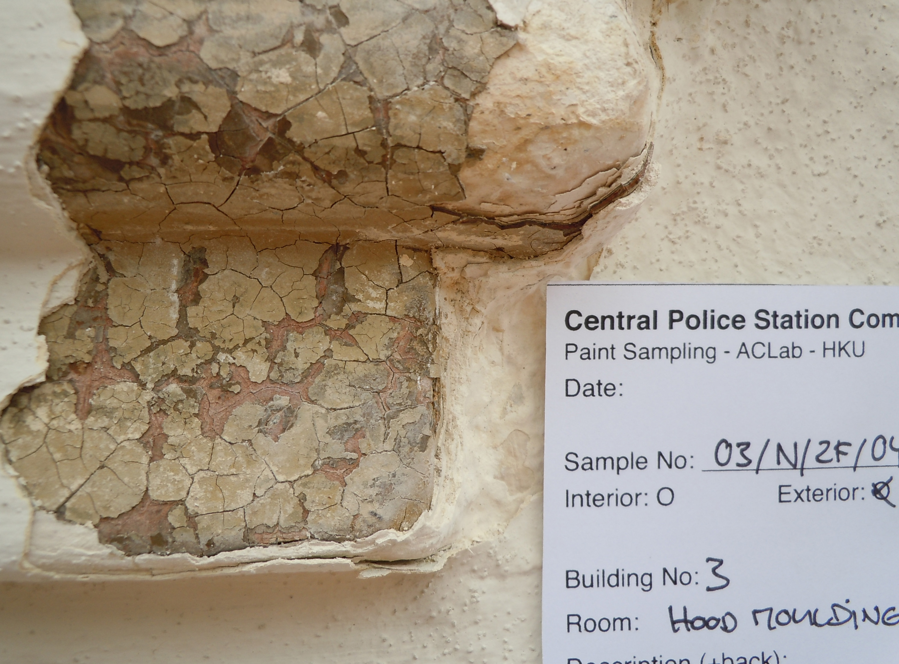 In March 2012 the Architectural Conservation Laboratory (ACLab) of the University of Hong Kong (Architectural Conservation Programmes (ACP) at the Faculty of Architecture), was invited to tender for this major paint sampling project via the Conservation Architects (Purcell) as part of the Central Police Station Revitalisation Project . For the analysis of architectural finishes at the CPS more than 400 samples of paint finishes from the exteriors and interiors of the various buildings were collected. The Architectural Conservation Laboratory invited Dr. Donald Ellsmore, who’s business in Australia is specialising in conservation analyses, planning and management, materials and finishes analyses to collaborate in the project . Dr. Ellsmore and I, assisted by Master students of the ACP Programmes worked intensely on site and in the laboratory and first results where presented after completion of the main stage of the project May-July 2012. The samples were processed to produce cross-sections in order to reveal, document and compare the decorative history of the buildings.